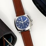 Le cinghie Cuoio Toscane hanno una bella lucentezza morbida e sono estremamente lisce al tatto. Ognuno di essi è fatto a mano secondo le nostre specifiche esatte e viene fornito con la nostra fodera in pelle blu chiaro per un tocco giocoso.